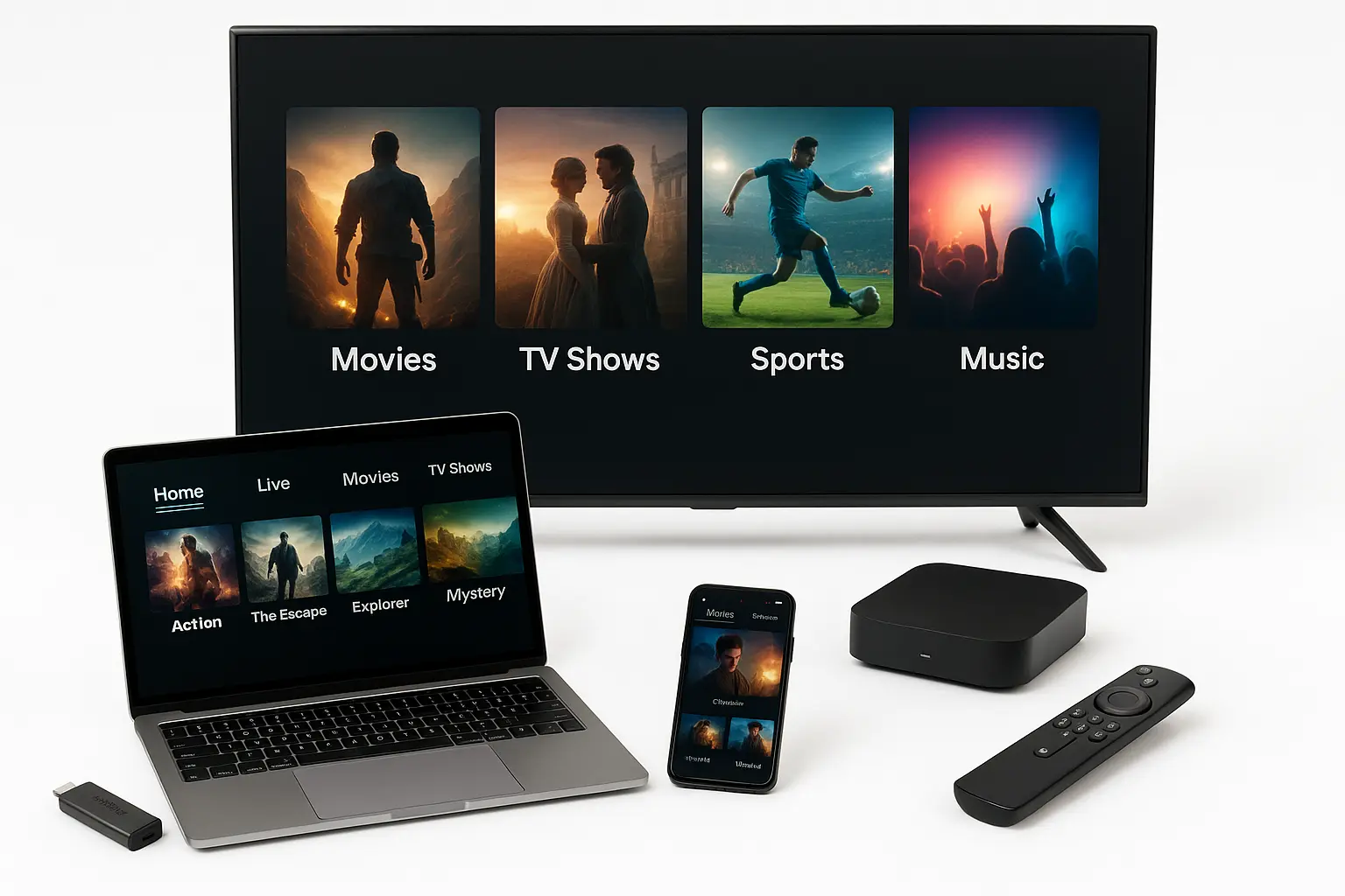 Unser IPTV Abo funktioniert auf allen Geräten: Smart TV (Samsung, LG), Android TV, Fire TV Stick, iOS, Windows, Mac, Receiver, Smartphone und mehr. Egal welches Gerät unsere stabile IPTV Line liefert flüssiges und hochwertiges Streaming.